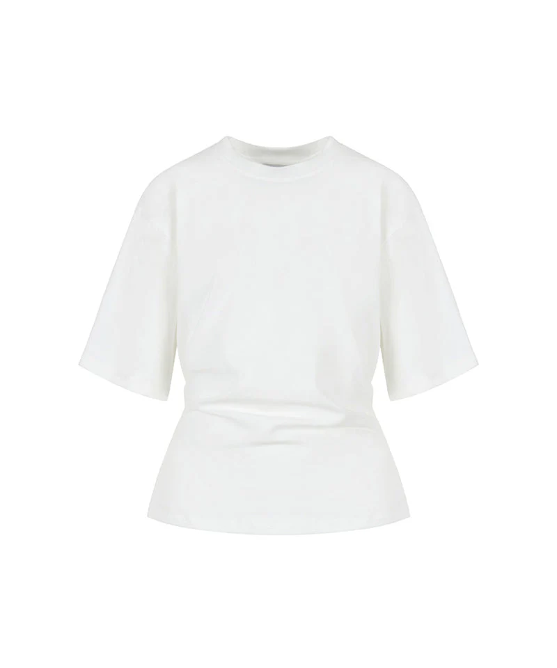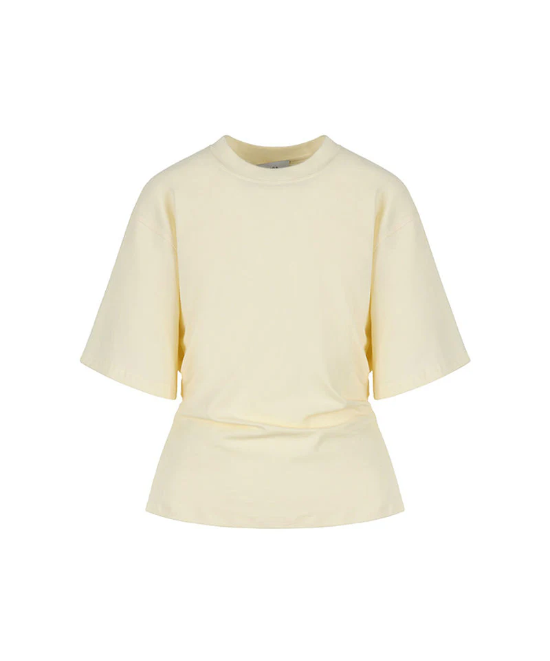 ウエストのタックデザインがアクセントのシンプルなTシャツ。